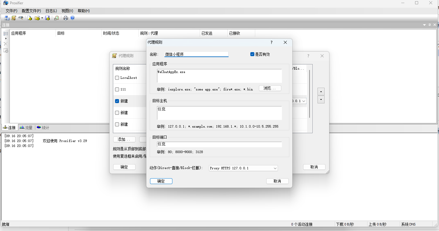 在Proxifier中添加一个代理服务器,类型为HTTP,地址为127.0.0.1,端口为8080(或其他与burp suite一致的端口)。在规则列表中添加一个规则,将微信小程序的流量都转发到该代理服务器。