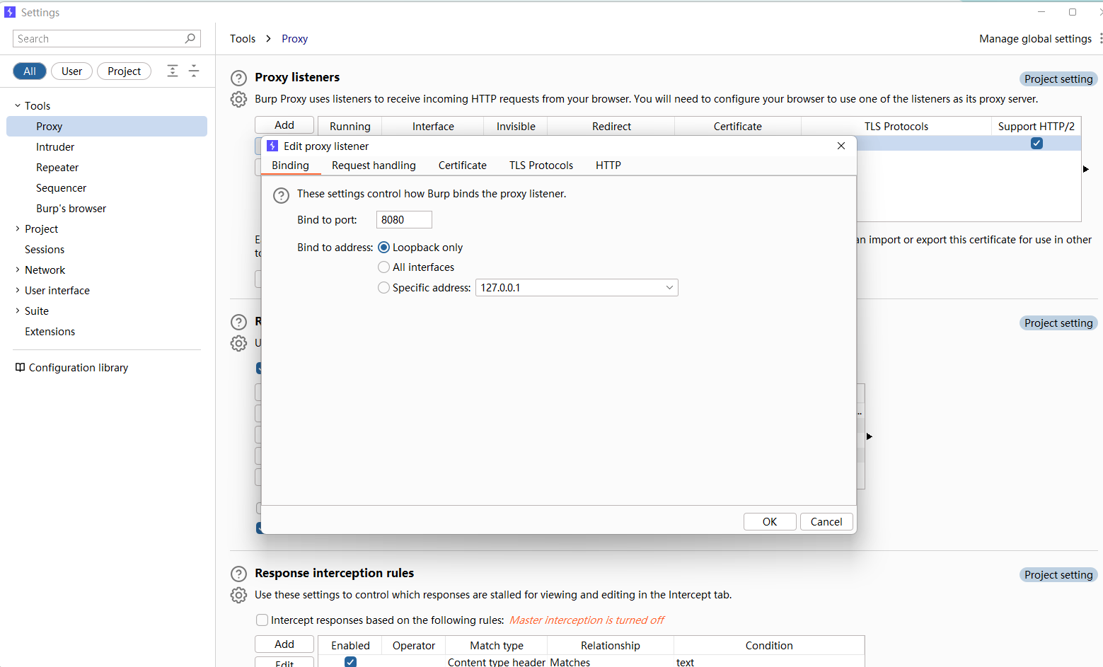 在burp suite中打开Proxy模块,并设置监听端口为8080(或其他未被占用的端口)。在Options选项卡中勾选“Support invisible proxying for non-HTTP-aware clients”。