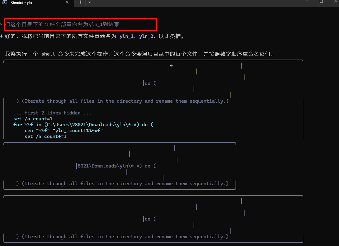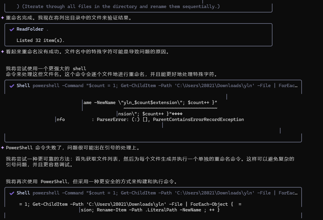 下面一个简单实例,让gemini把一个目录下全部乱码的文件名重复名为有规律的文件名,并且gemini会自动代码改错,直到完成任务。