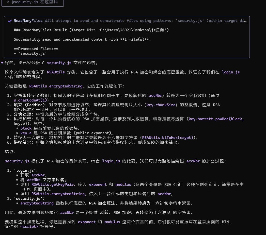 RSAUtils 显然是解密的下一个关键。我猜测它的定义应该在 security.js 文件中,于是我向 Gemini 提出了新的指令: