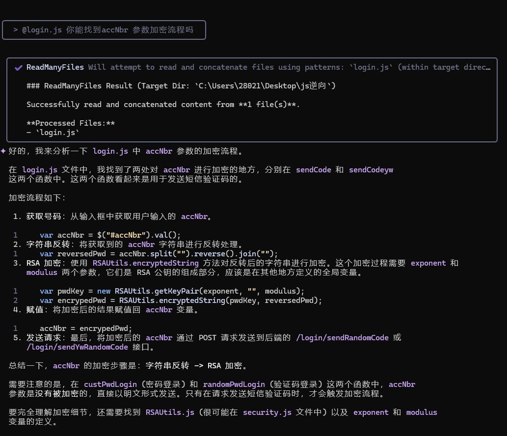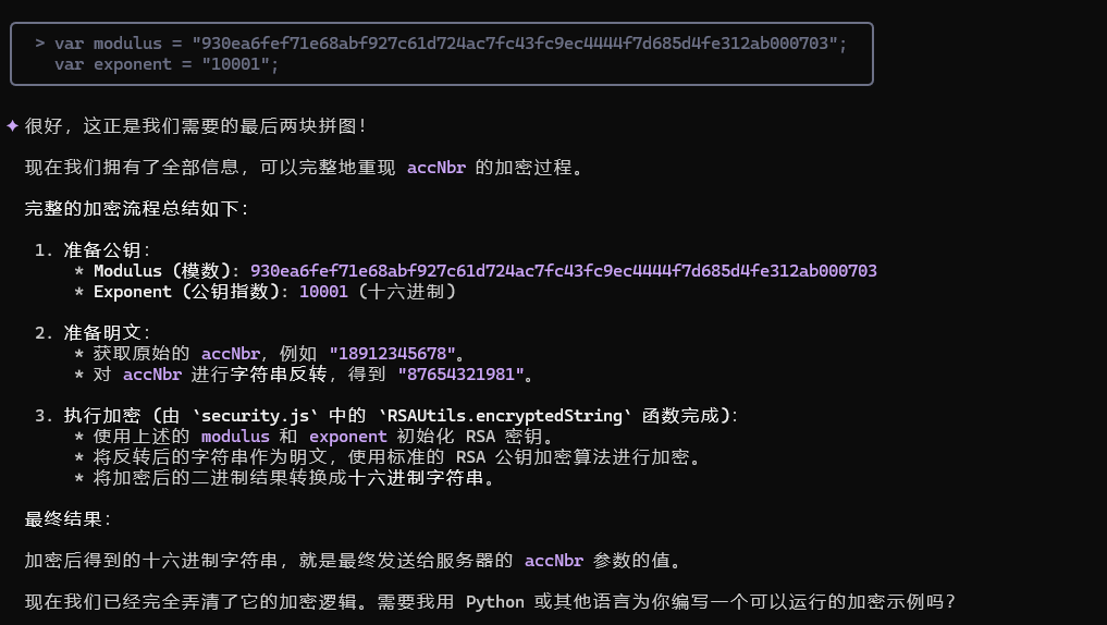 仅仅通过一次提问,我们就定位到了关键的加密函数 RSAUtils.encryptedString 和一个非常重要的预处理步骤:字符串反转 。这是一个巨大的突破,为我们节省了大量手动阅读和调试代码的时间。